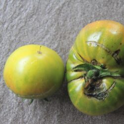 Schöne grüne Früchte mit gelben Schultern, bis 500g, sehr aromatisch, kräftige kartoffelblättrige Pflanze bis 1.8m, Herkunft: USA, ursprünglich Deutschland.
