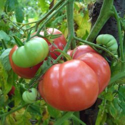 Beefsteaktyp, wuchsstark mit eher unregelmässigen Früchte bis 800g. Sehr aromatisch, wunderbare Süsse. USA (1894), in der Schweiz seit 1910 bekannt!