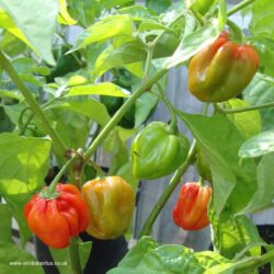 SPICY HOT! Capsicum chinense. So named because of its resemblance to a Tam o’ Shanter Scottish cap, this little pepper packs a rather powerful kick. Scotch Bonnet pepper seeds produce the brightly coloured chile peppers that are widely used in Jamaican and other Caribbean cooking, and have a flavour profile that is quite distinct from its close cousin the Habanero. If you want the traditional flavour of jerk paste, you have to use Scotch Bonnets. Give this variety a little extra time to mature and as much heat as possible. 150,000 – 325,000 SHUs. Plants may overwinter if protected, and can produce as perennials for a few years.