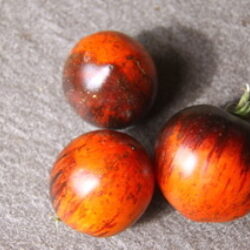 Farbenprächtige schwarzrote Sorte mit gelborange Flammung, Früchte 50-100g, spezielles interessantes Aroma, sehr lange lagerföhig, robust